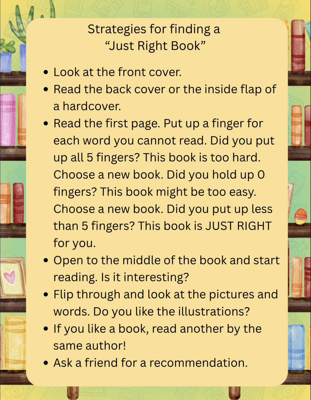 - Read the first page. Put up a finger for each word you cannot read. Did you put up all 5 fingers? This book is too hard. Choose a new book. Did you hold up 0 fingers? This book might be