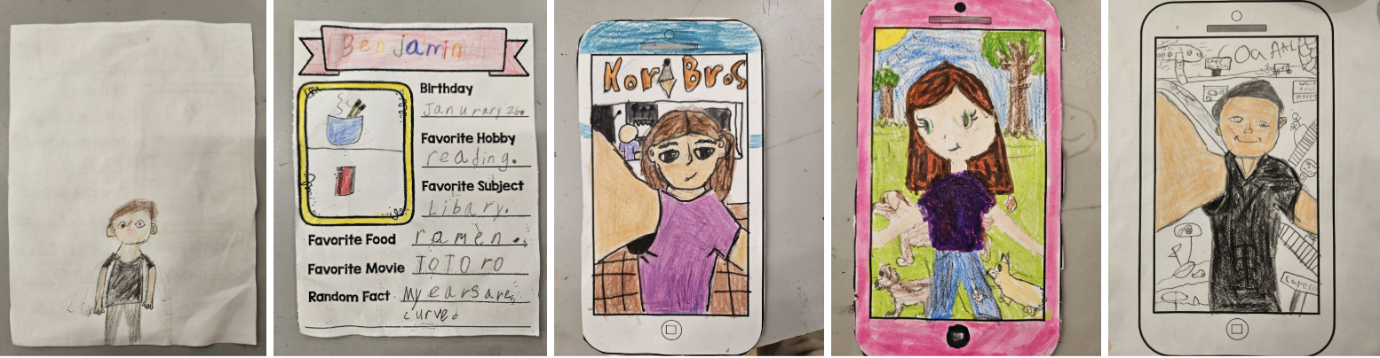 they did over the summer (or are looking forward to in the school year). First through third graders made “Me as a trading card”, creating self-portraits and sharing their individual interests. Our youngest students have