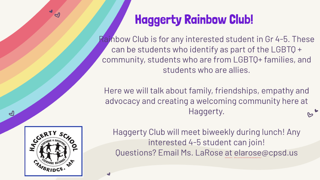 Rainbow Club is for any interested student in Gr. 4-5. These can be students who identify as part of the LGBTQ+ community, students who are from LGBTQ+ families, and students who are